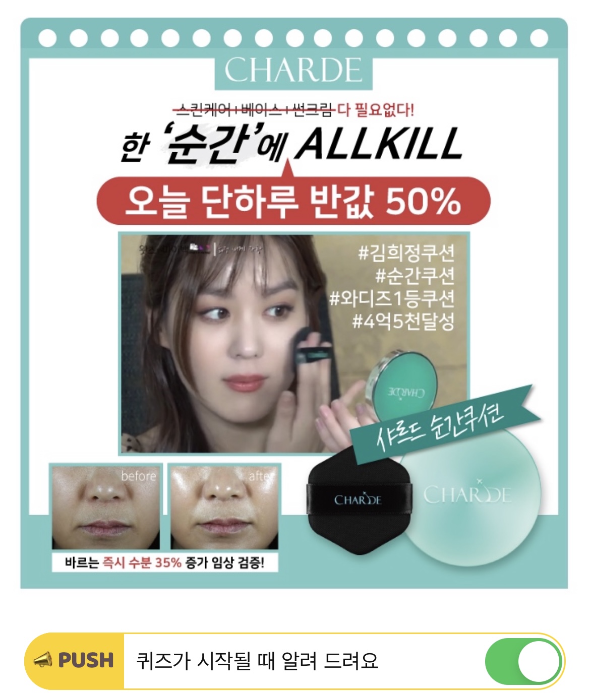 샤르드 순간쿠션은 수분에센스가 OO% 함유되어있어 기초없이도 바르자마자 피부가 촉촉 물광으로 표현을 할 수 있습니다. 여기서 빈칸에 들어갈 숫자는 무엇일까요?