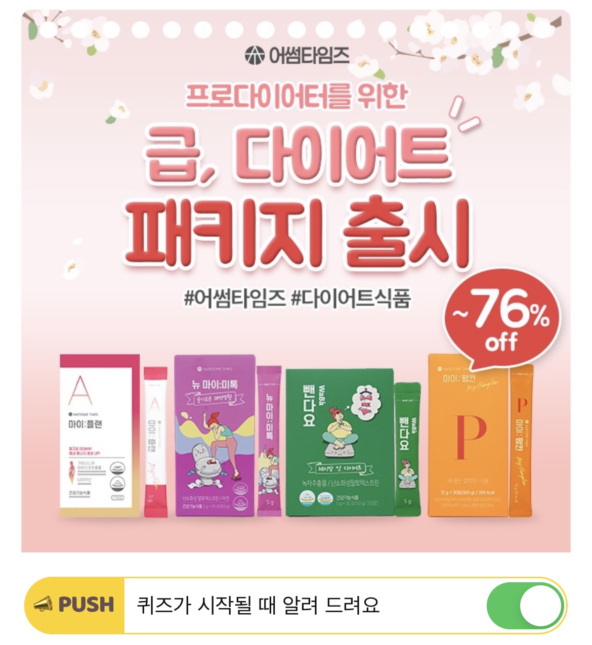 어썸타임즈 다이어트대란전에는 한정수량 패키지를 최대 61% 할인된 가격에 구매하실 수 있습니다. 한정수량 패키지 중 OOO패키지는 야식을 즐겨먹는 분들에게 추천드립니다. OOO에 들어갈 단어는 무엇일까요? (초성힌트 : ㅇㅅㄹ)