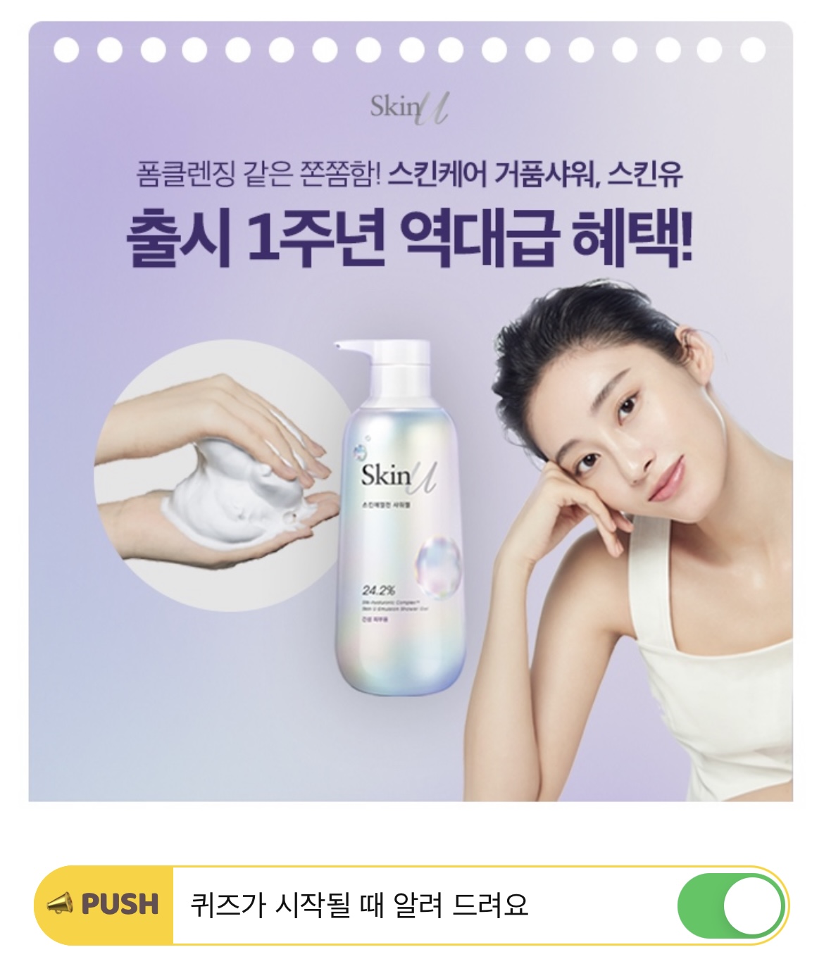 자꾸 만지고 싶은 살결의 시작, 스킨유 바디워시는 거품이 특별한 OOOO 거품입니다. 여기서, OOOO는 무엇일까요? (초성힌트 : ㅅㅋㅋㅇ)