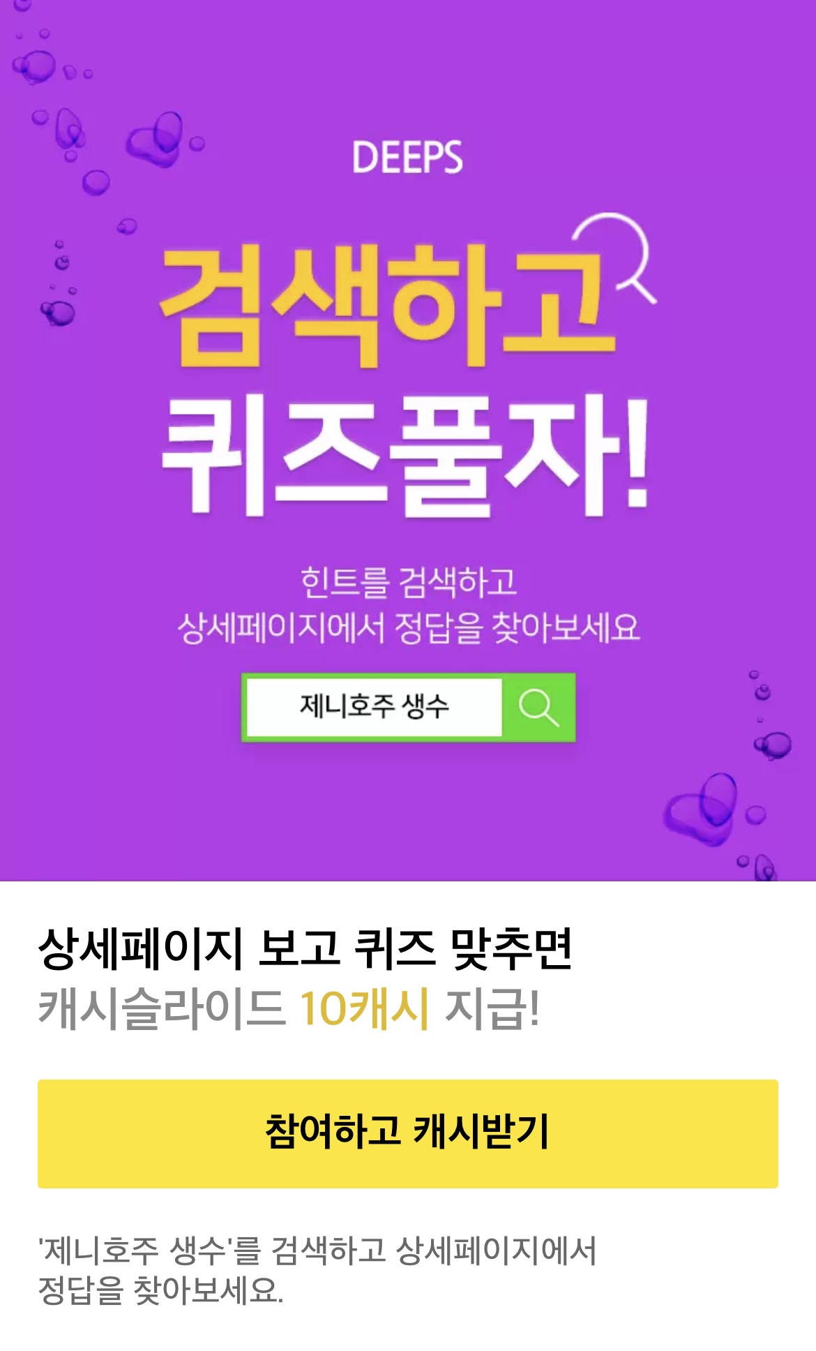 상세페이지 보고 퀴즈 맞추면 캐시슬라이드 10캐시 지급