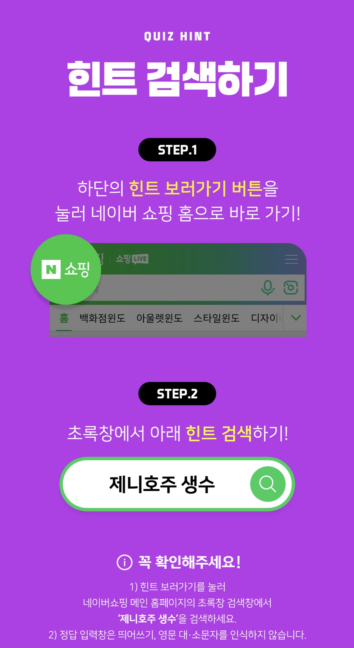 1) 힌트 보러가기를 눌러 네이버쇼핑 메인 홈페이지의 초록창 검색창에서 제니호수 생수을 검색하세요