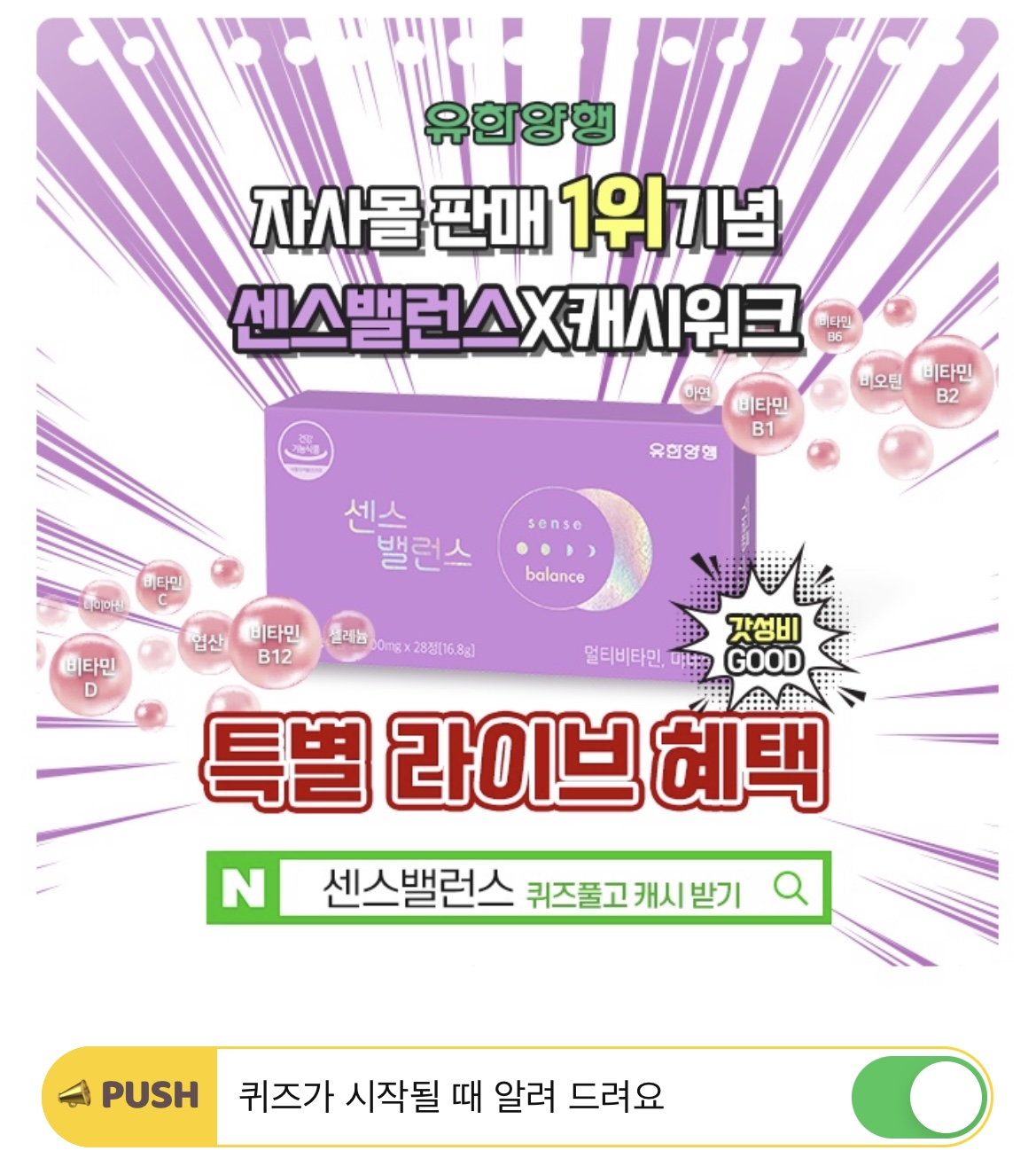 내 몸의 OOOOO를 위해 유한양행 센스밸런스 지금 바로 시작하세요! 할인혜택과 다양한 사은품까지 받아갈 수 있는 기회! 퀴즈풀고 캐시도 받자!