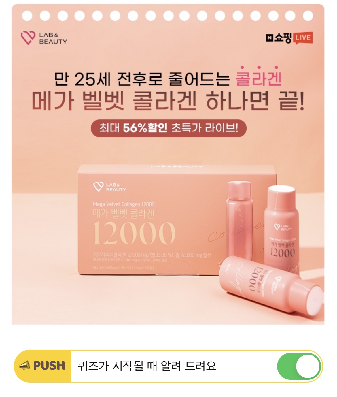 국내 최초 12,000mg의 콜라겐을 OOml 단 한 병에 담은 메가 벨벳 콜라겐은 한입에 콜라겐을 가득 채울 수 있고 감미료, 착색료, 보존료가 들어있지 않아 안심하고 섭취할 수 있습니다. 빈칸에 들어갈 숫자는 무엇일까요?