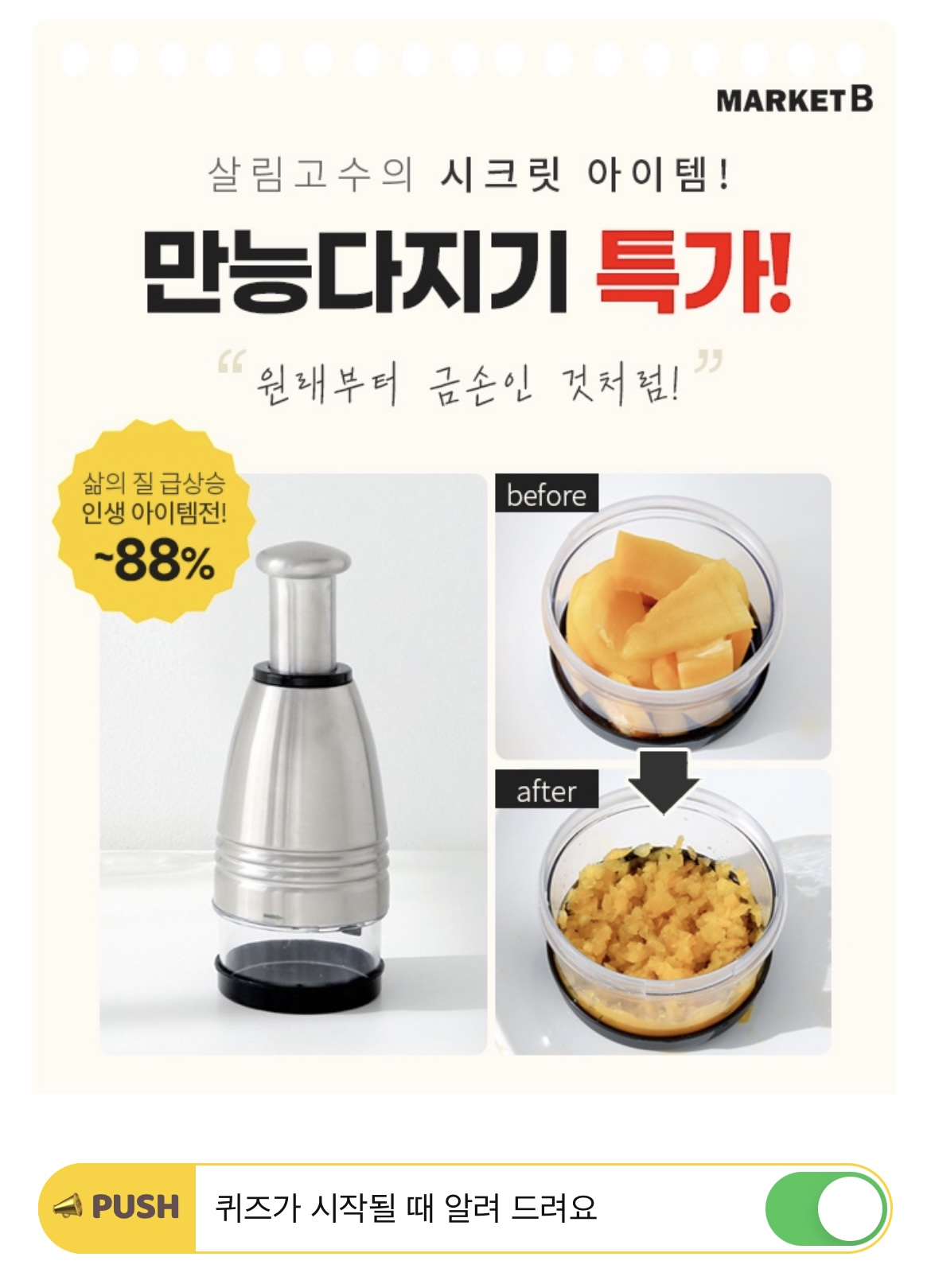 살림고수의 시크릿 아이템, "마켓비 LIDELL 야채다지기 OOOOO"는 대한민국 최고 시험·인증기관인 한국건설생활환경시험연구원(KCL)으로부터 제품 각 부품에 대해 깐깐한 검사와 품질시험을 통과한 안전하고 위생적인 제품입니다. OOOOO에 들어갈 단어는 무엇일까요?
