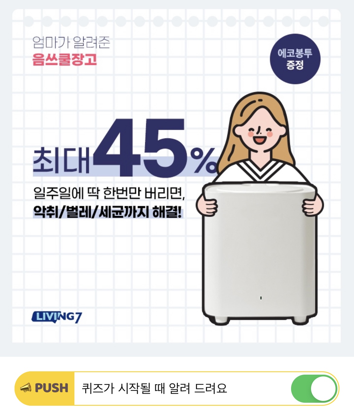 리빙7 음쓰쿨장고는 OO효율성 30% UP하는 상품입니다. OO에 들어갈 단어는 무엇일까요? (힌트 : ㄴㅈ)