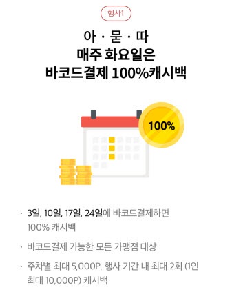 - 주차별 최대 5000P, 행사 기간 내 최대 2회(1인 최대 10,000P) 캐시백.